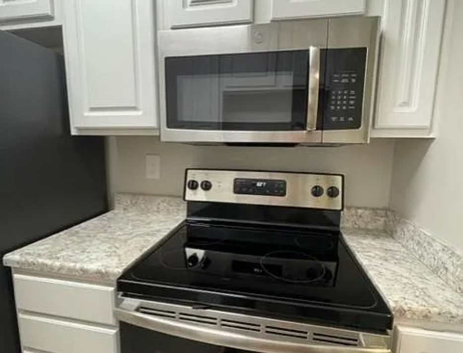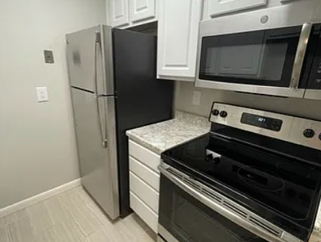 Inside, each apartment offers a spacious living room with a large double window that fills the space with natural light. The newly remodeled galley-style kitchen includes brand-new cabinets, countertops, and stainless-steel appliances including a built-in microwave, stove, refrigerator, and dishwasher.